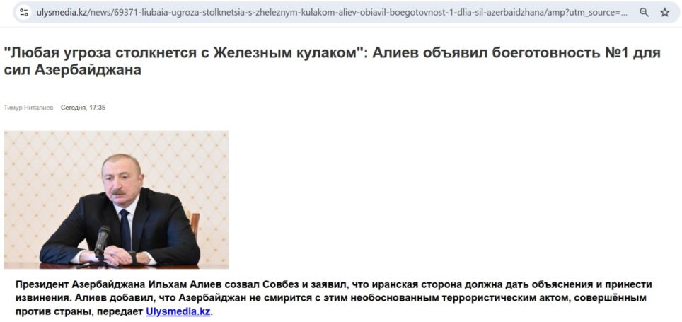 “Ulysmedia.kz” yazır ki, dövlət başçısı İrandan izahat və üzr istəməyi tələb edib. Məqalədə qeyd edilir ki, Prezident İlham Əliyev Azərbaycana qarşı terror hücumunu Bakının bundan əvvəlki bütün addımları fonunda həddindən artıq nankorluq aktı adlandırıb.
