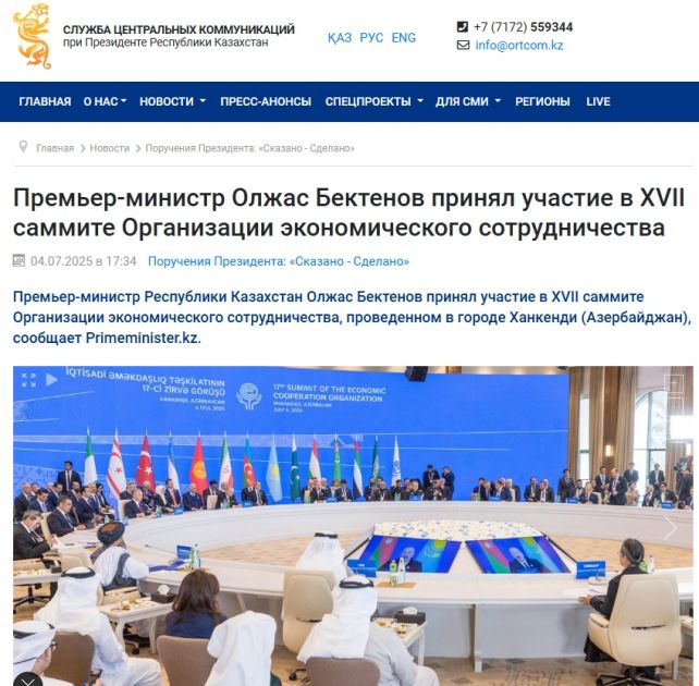 Qazaxıstan mediası Baş nazir Oljas Bektenovun İqtisadi Əməkdaşlıq Təşkilatının (İƏT) 17-ci Zirvə görüşündə iştirak etmək üçün Xankəndi şəhərinə səfərini geniş işıqlandırıb.