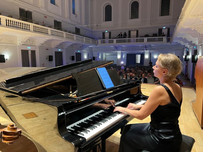 Konsert proqramında soprano səsinin sahibi, Milan şəhərində yaşayan həmvətənlimiz, opera müğənnisi Çinarə Şirinova çıxış edib. O, fortepiano müşayiəti ilə Üzeyir Hacıbəylinin əsərlərini səsləndirərək Azərbaycan musiqisinin zənginliyini tamaşaçılara təqdim edib.