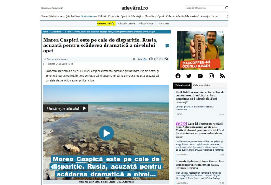 Rumıniyanın “Adevărul” qəzeti yazır ki, Xəzər dənizi son onilliklərdə sürətlə dayazlaşır və bu proses artıq region ölkələrinin iqtisadiyyatına və ekoloji tarazlığına ciddi təsir göstərir. Məqalədə qeyd olunur ki, son 5 ildə dənizin səviyyəsi 93 santimetr, son 10 ildə 1,5 metr, son 30 ildə isə 2,5 metr azalıb. Hazırda illik azalma tempi 20–30 santimetr təşkil edir.