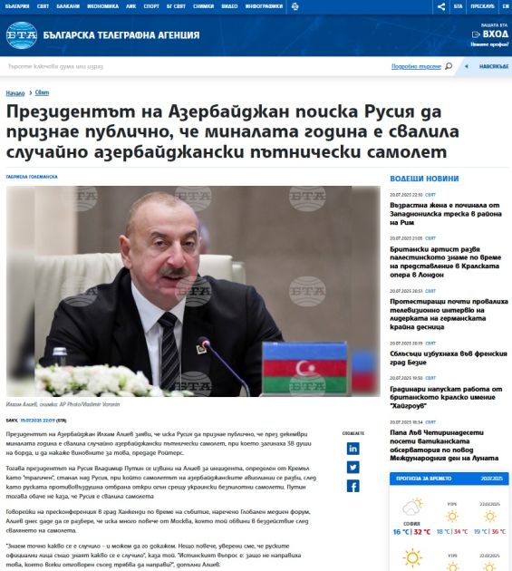 Rumıniyanın “Evenimentul Zilei”, “Mediafax” media orqanları, o cümlədən AGEPRES milli xəbər agentliyi, həmçinin, Bolqarıstanın BTA xəbər agentliyi, “24 chasa” və digər nəşrləri bildirirlər ki, dövlət başçısı Rusiyanın Azərbaycanın sərnişin təyyarəsini vurduğunu rəsmi şəkildə qəbul etməsini vacib hesab edir.