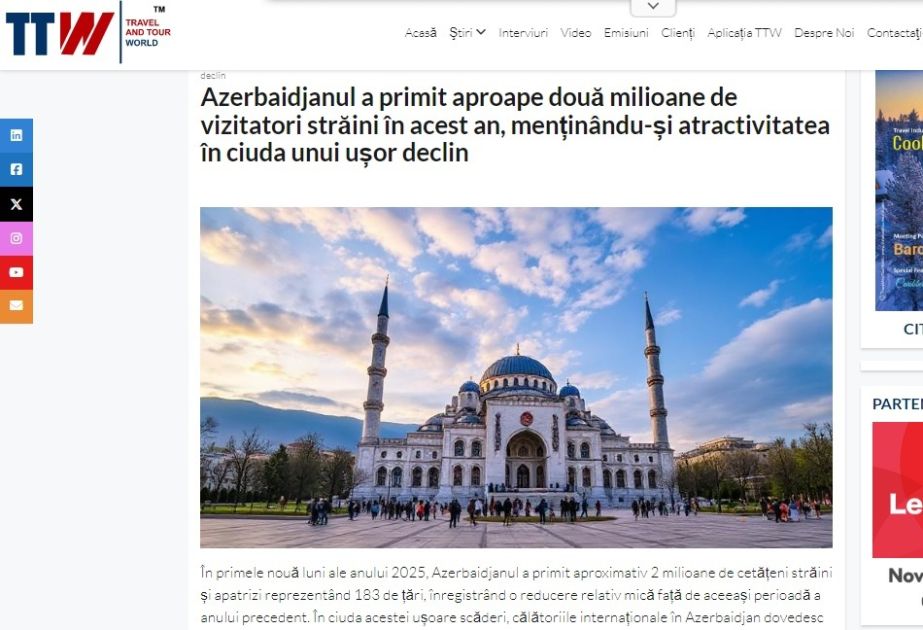 Rumıniyanın nüfuzlu “Travel and Tour World” turizm xəbər portalında dərc olunan məlumatlara görə, Azərbaycan bu il turizm sektorunda sabit dinamikanı qoruyub saxlayıb.