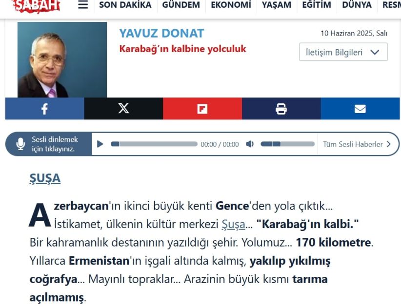 Türkiyənin tanınmış jurnalisti Yavuz Donat “Sabah” qəzetinin çoxmilyonlu oxucu auditoriyasını Azərbaycanın işğaldan azad edilmiş ərazilərinin bərpası prosesi, o cümlədən ölkəmizin mədəniyyət paytaxtı – Şuşa şəhəri ilə bağlı reallıqlarla tanış edib.