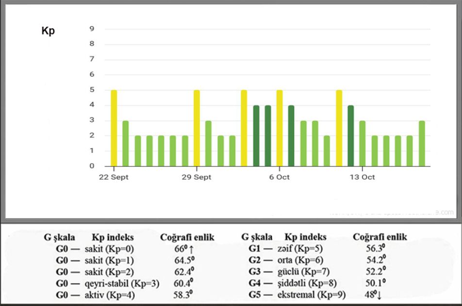 Geomaqnit sahəsinin mənfi qütblü tac dəliyi axınlarının təsiri ilə bu gün G1 (zəif geomaqnit qasırğası) səviyyəsinə yüksəlməsi ehtimalı var. Sonrakı günlərdə isə əsasən sakit səviyyələrin müşahidə olunacağı gözlənilir.