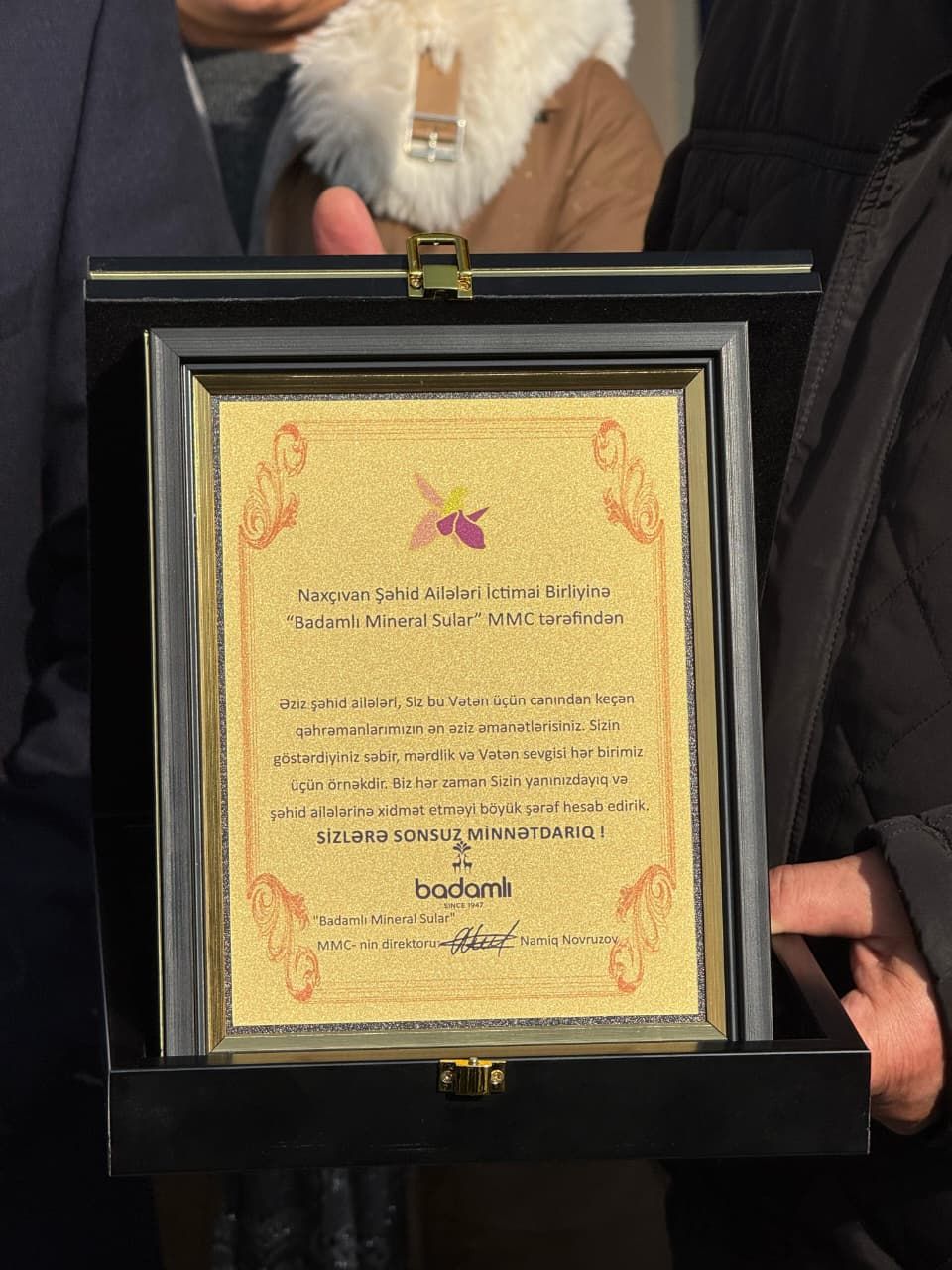 İctimai birliyə müəssisə adından minnətdatlıq plaketləri təqdim edilmişdir. Daha sonra müəsissədə şəhid ailələri üçün çay süfrəsi açılmışdır.