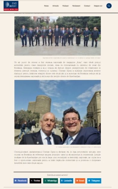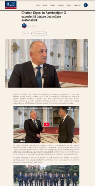 Rumıniya parlamentinin üzvü, senator Kristian Sipos Rumıniya-Azərbaycan dostluq qrupu çərçivəsində ölkəmizə rəsmi səfəri barədə video və yazılı məqalə şəklində müsahibə verib. O qeyd edib ki, səfər zamanı ikitərəfli münasibətlərin gücləndirilməsi ilə yanaşı, Azərbaycanın inkişaf modeli və təbii sərvətlərindən istifadəsi diqqət mərkəzində olub.