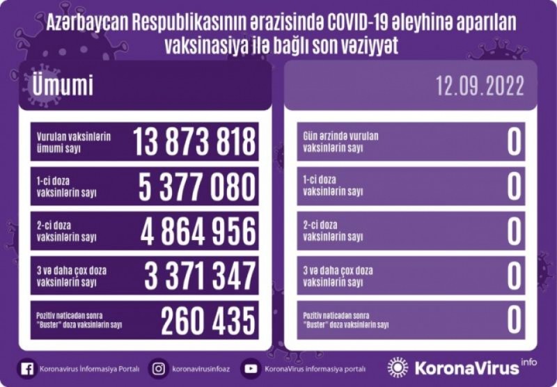 Nazirlər Kabineti yanında Operativ Qərargahdan AZƏRTAC-a bildirilib ki, Azərbaycanda bu günə qədər vurulan vaksin dozalarının ümumi sayı 13 milyon 873 min 818, birinci mərhələ üzrə vurulan peyvənd dozalarının ümumi sayı 5 milyon 377 min 80, ikinci mərhələ üzrə 4 milyon 864 min 956, üç və daha çox doza vaksinlərin sayı 3 milyon 371 min 347, pozitiv nəticədən sonra “buster” doza vaksinlərin sayı 260 min 435-dir.