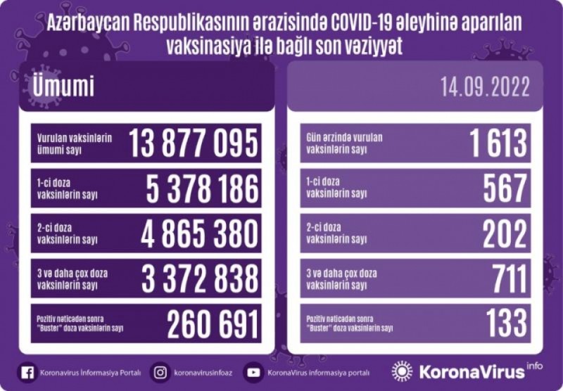 Sentyabrın 14-də Azərbaycanda yeni növ koronavirus (COVID-19) infeksiyası əleyhinə 1613 doza vaksin vurulub.
