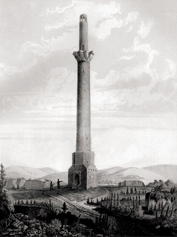1836-cı ildə nəşr olunmuş "Qafqazda rus mülkləri haqqında icmal" əsərində qüllə haqqında yazılıb: "Orada olan bütün abidələrdən ən diqqətçəkəni Şəmkir sütunudur. Şəhərdən 25 verst aralıda, Şəmkir çayının sol sahilində düzənliklər arasında tikilmiş və demək olar ki, 30 verstdən görünən Şəmkir qülləsidir. Qalanın əsası kub biçimlidir və onun eni 7, hündürlüyü 5 arşındır. Üzərində diametri əsasda 5, yuxarıda 4 arşınacan olan dairəvi sütun yüksəlir. Üst hissə hər tərəfi 5 arşın olan dördbucaqlı karnizlə dövrələnib. Karnizin altında kufi xətti ilə yazılmış böyük kitabə var. Qüllənin ortasında 124 iri, demək olar ki, dağılmış dolama pilləkən var ki, onunla qalxmaq xeyli çətindir. Qüllə kərpicdən, qum və xırda daşla qarışdırılmış gəclə tikilib. İş olduqca gözəl və möhkəmdir. Sement məhlulu elə bərkdir ki, kərpiclə tamam birləşib. Zamanın artıq çox yerdən bu gözəl abidəni dağıtdığına heyfslənmədən baxmaq olmur və hətta qüllənin əyilməsi də aydınca hiss edilir. Çox güman ki, bu, minarədən başqa bir şey deyildi, onun zirvəsindən müsəlmanlar azan oxuyurdular".