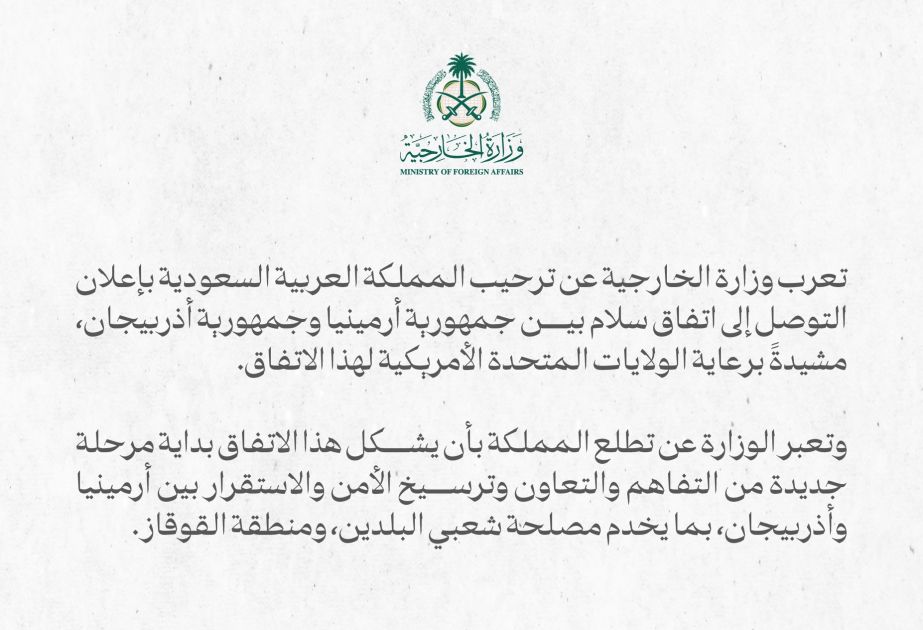 Səudiyyə Ərəbistanı Krallığının Xarici İşlər Nazirliyi (XİN) ABŞ-ın iştirakı ilə Ermənistan Respublikası və Azərbaycan Respublikası arasında əldə edilmiş sülh razılaşmasını alqışlayır.