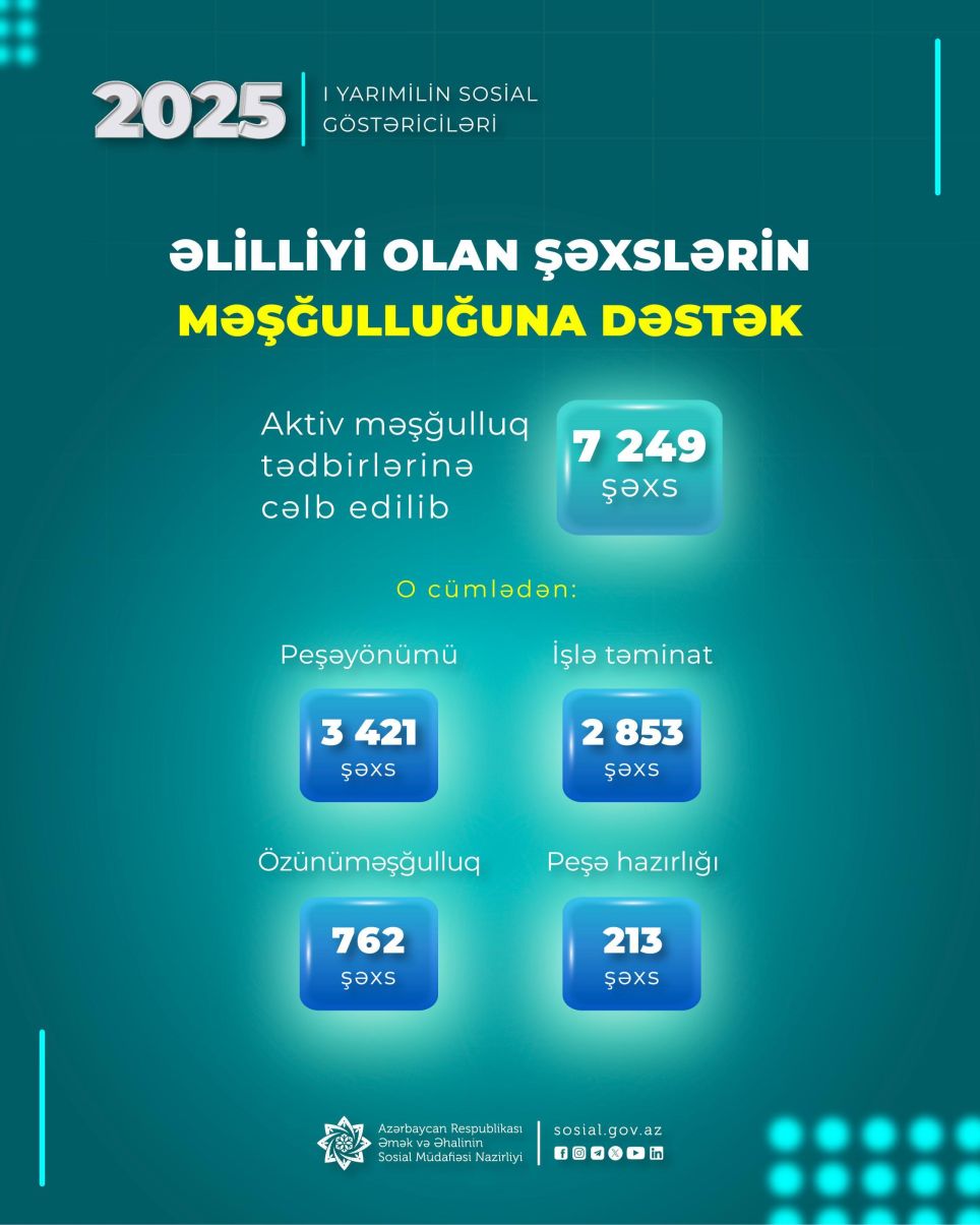 Əmək və Əhalinin Sosial Müdafiəsi Nazirliyinin tabeliyində Dövlət Məşğulluq Agentliyi tərəfindən 2025-ci ilin 6 ayı ərzində əlilliyi olan 7249 şəxs aktiv məşğulluq tədbirlərinə cəlb edilib.
