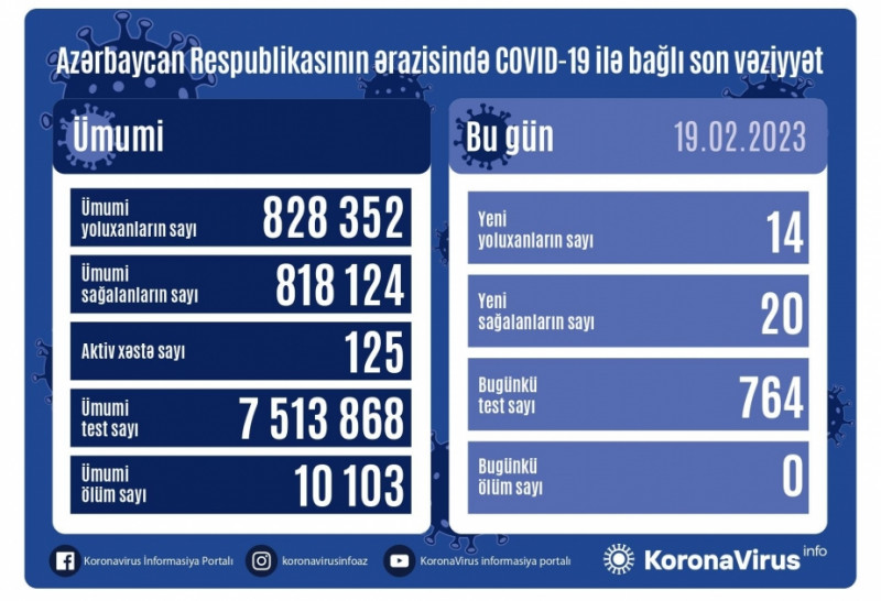 Son sutkada Azərbaycanda yeni növ koronavirus (COVID-19) infeksiyasına 14 yoluxma faktı qeydə alınıb, 20 nəfər müalicə olunaraq sağalıb.
