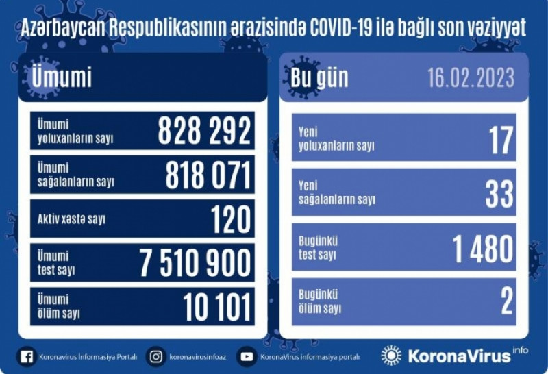 Son sutkada Azərbaycanda yeni növ koronavirus (COVID-19) infeksiyasına 17 yoluxma faktı qeydə alınıb, 33 nəfər müalicə olunaraq sağalıb.