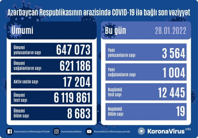 Son sutkada yeni yoluxma hallarının müəyyənləşdirilməsi ilə əlaqədar 12 min 445, bu günə qədər isə ümumilikdə 6 milyon 119 min 861 test icra olunub.