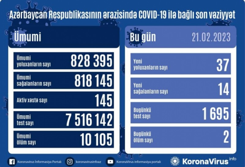 Son sutkada yeni yoluxma hallarının müəyyənləşdirilməsi ilə əlaqədar 1695, bu günə qədər isə ümumilikdə 7 milyon 516 min 142 test icra olunub.