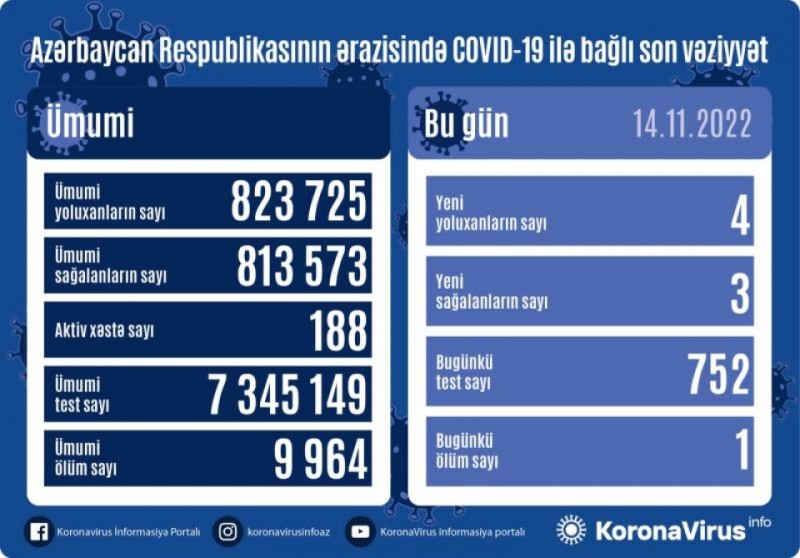 Son sutkada yeni yoluxma hallarının müəyyənləşdirilməsi ilə əlaqədar 752, bu günə qədər isə ümumilikdə 7 milyon 345 min 149 test icra olunub.
