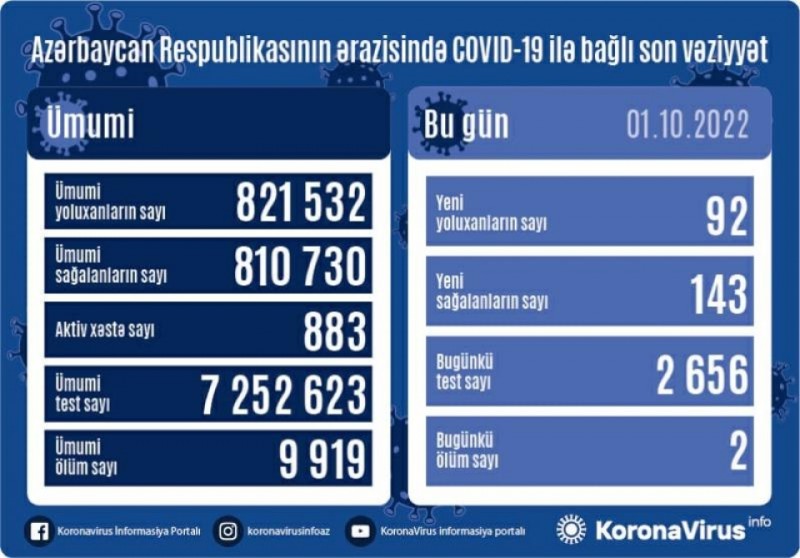 Son sutkada yeni yoluxma hallarının müəyyənləşdirilməsi ilə əlaqədar 2 min 656, bu günə qədər isə ümumilikdə 7 milyon 252 min 623 test icra olunub.