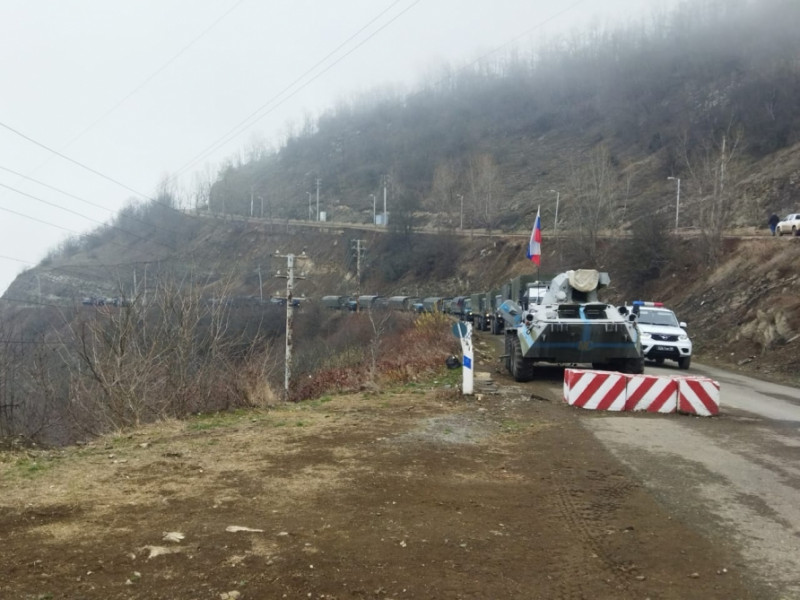 Rusiya sülhməramlılarına məxsus avtomobillər Laçın-Xankəndi yolunda dinc aksiya keçirilən ərazidən maneəsiz hərəkət edir.