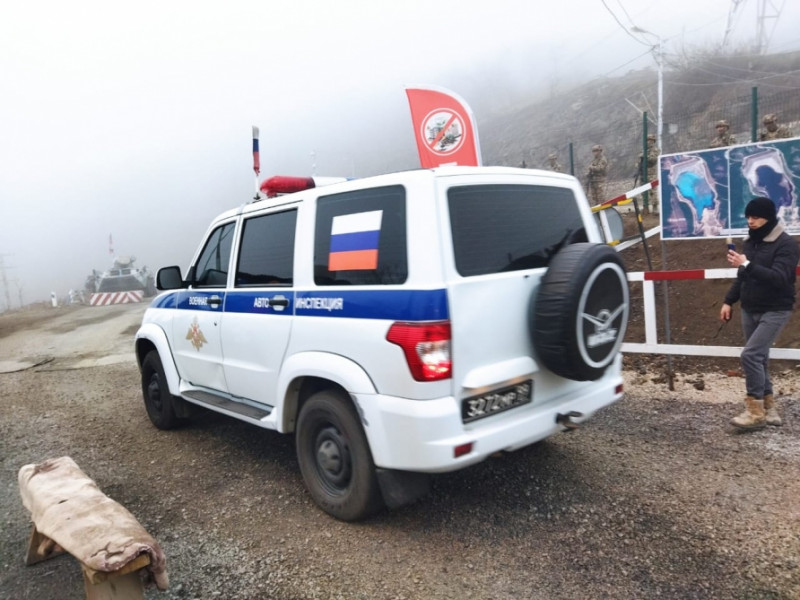Rusiya sülhməramlılarına məxsus avtomobillər Laçın-Xankəndi yolunda dinc aksiya keçirilən ərazidən maneəsiz hərəkət edir.