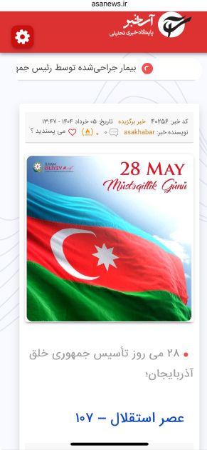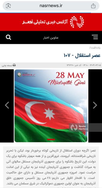 İranın Təbriz şəhərində fəaliyyət göstərən “Nəsr” və “Asanews” agentliklərinin saytında Azərbaycanın Müstəqillik Gününə həsr olunmuş “İstiqlal çağı – 107” sərlövhəli geniş məqalə dərc olunub.