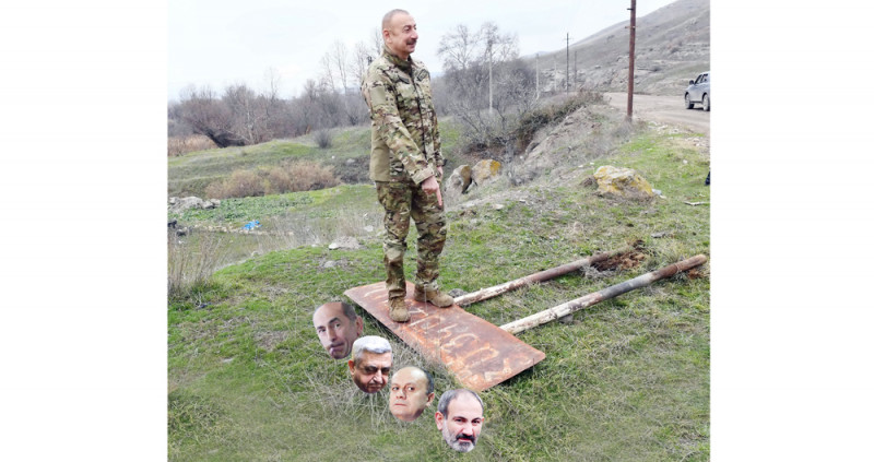 * "Qarabağ Ermənistandır nöqtə" deyərək Azərbaycan Prezidentinin qəzəbinə düçar olan, diz üstə çökdürülən, beli sındırılan, "dəmir yumruq"la başı əzilən Paşinyan!