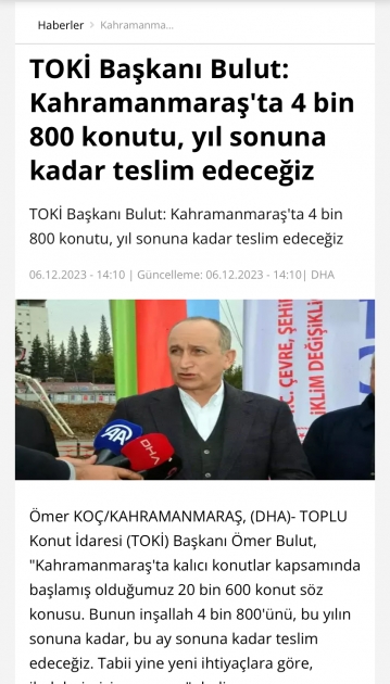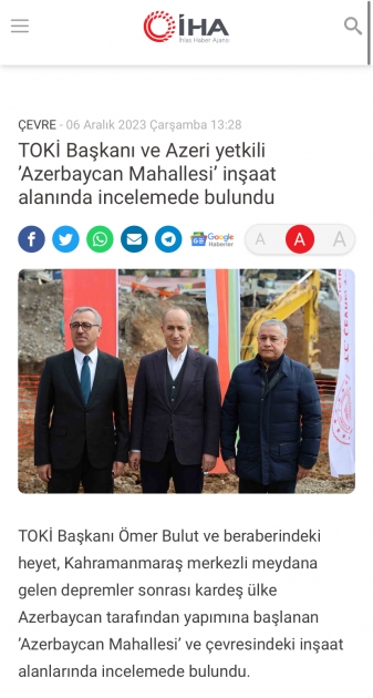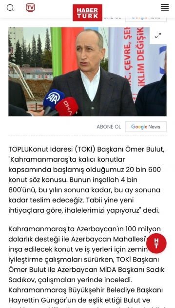 “İhlas Xəbər Agentliyi”nin (İHA) “TOKİ sədri və Azərbaycan rəsmisi Azərbaycan məhəlləsinin inşa edildiyi əraziyə baxış keçiriblər” sərlövhəli yazısında bu ifadələr yer alıb: “Zəlzələ bölgəsinin yenidən qurulmasında mühüm rol oynayan Azərbaycan Kahramanmaraşda min ev inşa edəcək. Şəhərdə Azərbaycan rayonunun yaradılması işlərinə başlanılıb. Azərbaycan 320 hektar ərazidə salınacaq məhəllənin 100 milyon dollarlıq hissəsini Azərbaycan ödəyəcək”.