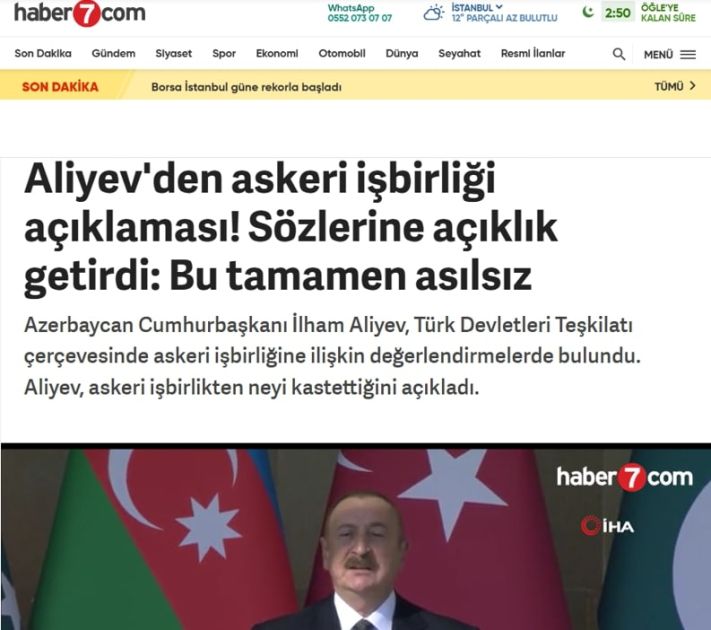AZƏRTAC xəbər verir ki, qardaş ölkənin televiziya kanalları, xəbər agentlikləri və qəzetləri Azərbaycan liderinin Türk Dövlətləri Təşkilatı çərçivəsində müdafiə əməkdaşlığının vacibliyi ilə bağlı fikirlərinə, eləcə də Prezident İlham Əliyevin Türkiyə ilə müttəfiqlik əlaqələrinin dərinləşdirilməsi ilə bağlı açıqlamalarına diqqət yetiriblər.