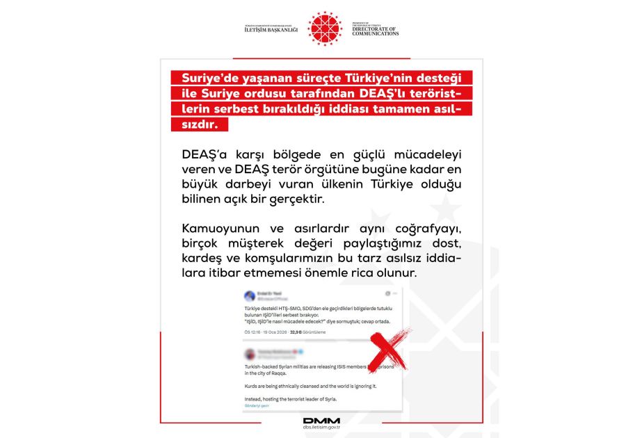 Türkiyə Prezidenti Administrasiyasının İctimaiyyətlə əlaqələr departamenti son günlər Suriyada baş verən hadisələrlə bağlı yayılan yalan xəbərlərlə əlaqədar açıqlama verib.