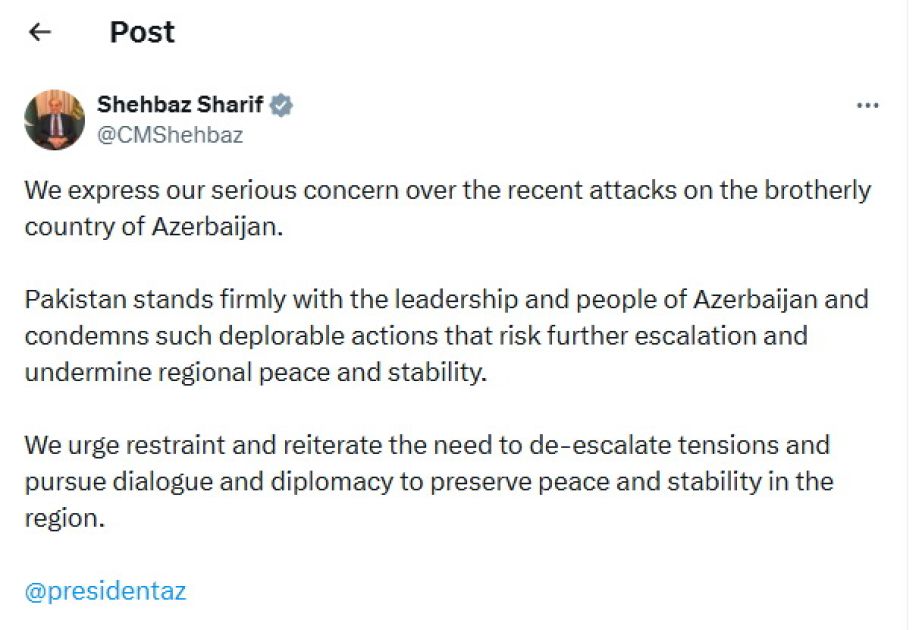 Şahbaz Şərif Pakistanın Azərbaycanla həmrəyliyini ifadə edib