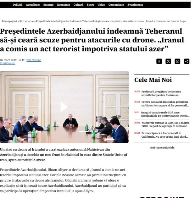 Rumıniya mətbuatı Prezident İlham Əliyevin İranın hücumu ilə bağlı çıxışından yazıb