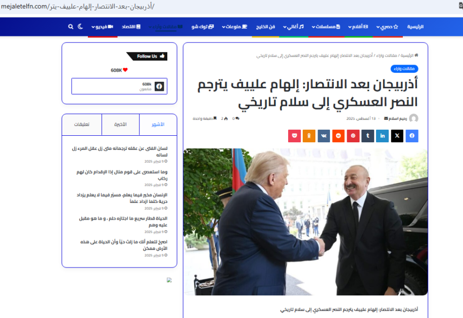 Vaşinqtonda Azərbaycan Prezidenti İlham Əliyev, Ermənistanın Baş naziri Nikol Paşinyan və ABŞ Prezidenti Donald Trampın iştirakı ilə imzalanan üçtərəfli Birgə Bəyannamə ərəb ölkələrinin media orqanlarında geniş şəkildə işıqlandırılıb.