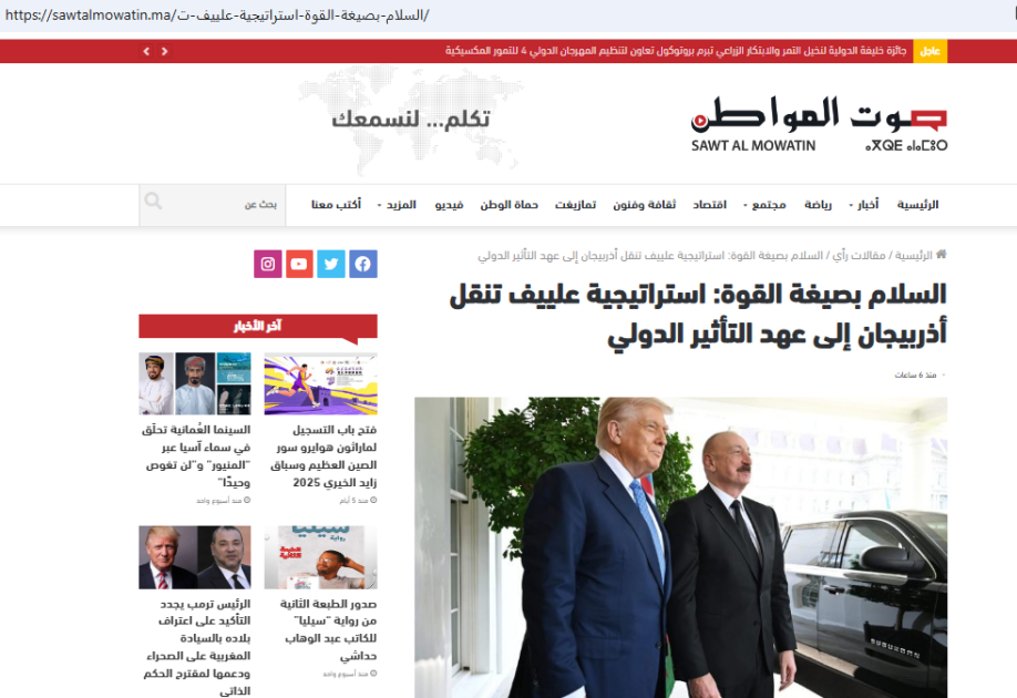 AZƏRTAC xəbər verir ki, Diaspor Fəaliyyətinə Jurnalistlərin Dəstəyi İctimai Birliyinin sədri Fuad Hüseynzadənin “Qələbədən sonra sülh – Liderin tarixi missiyası” sərlövhəli analitik məqaləsi Küveyt, Misir, Mərakeş, Əlcəzair və Mavritaniyanın bir sıra xəbər portallarında dərc olunub.