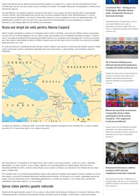 Rumıniyanın nüfuzlu “Cursul de Guvernare” (“Hakimiyyət Kursu”) analitik nəşrində Vladimir Yoneskunun yazdığı analitik məqalədə Avropa Komissiyasının Prezidenti Ursula fon der Leyenin iştirakı ilə Səmərqənddə keçirilmiş Aİ–Orta Asiya Sammitində aparılan müzakirələr barədə söz açılıb. Müəllif diqqətə çatdırır ki, Avropa İttifaqı (Aİ) Rusiya qazından asılılığı azaltmaq və yaşıl enerji keçidini sürətləndirmək məqsədilə Orta Asiya ölkələri ilə enerji və mineral əməkdaşlığını genişləndirməyə çalışır.
