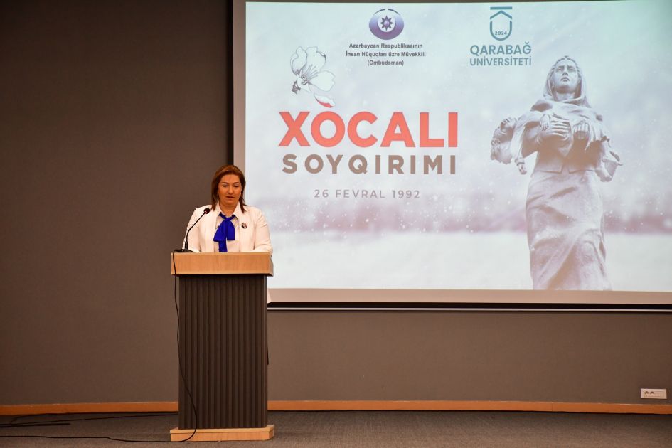 Azərbaycan Respublikasının insan hüquqları üzrə müvəkkili (ombudsman) Səbinə Əliyeva tədbirdə çıxış edərək, Xocalı faciəsinin Azərbaycan xalqının tarixi yaddaşında silinməz iz buraxdığını, beynəlxalq humanitar hüququn norma və prinsiplərinin kobud şəkildə pozulması ilə müşayiət olunan insanlığa qarşı ağır cinayət olduğunu bildirib.