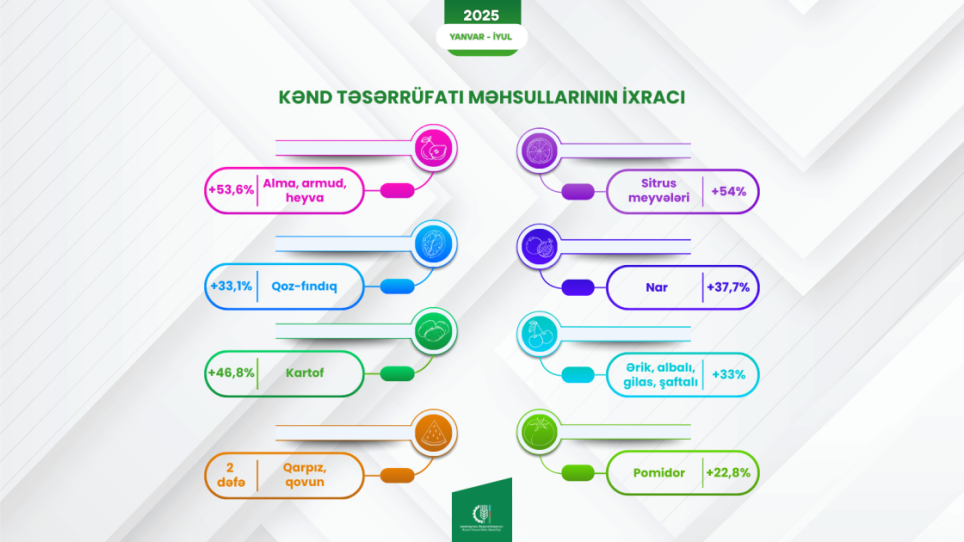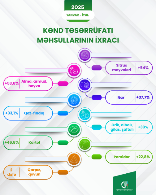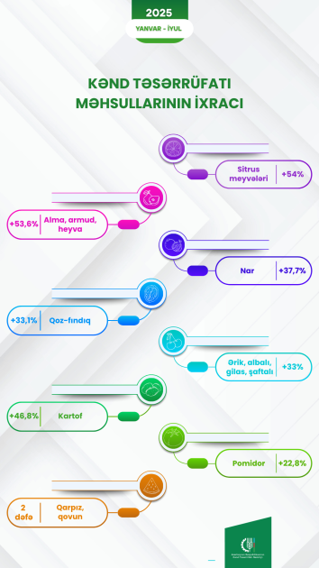 Kənd Təsərrüfatı Nazirliyinin İctimaiyyətlə əlaqələr və informasiya təminatı şöbəsindən AZƏRTAC-a bildirilib ki, bu ilin yanvar-iyul aylarında ötən ilin müvafiq dövrü ilə müqayisədə qoz-fındıq ixracı 33,1 faiz, sitrus meyvələri ixracı 54 faiz, alma, armud və heyva ixracı 53,6 faiz, ərik, albalı, gilas, şaftalı ixracı 33 faiz, nar ixracı 37,7 faiz, digər meyvələrin ixracı isə 76,2 faiz artıb.