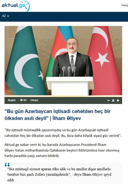 Gürcüstanın nüfuzlu “1tv.ge”, “24news.ge”, “aktual.ge”, “interpress.ge” portalları Azərbaycanda Vətən müharibəsində Qələbənin 5-ci ildönümü ilə bağlı təşkil olunan Hərbi parad və bayramla bağlı xəbərlər yayıblar. Yayımlanan xəbərlərdə Azərbaycanda Zəfər Gününün təntənəli şəkildə qeyd olunması, Vətən müharibəsində Qələbənin beşinci ildönümü ilə bağlı Bakıda keçirilən Hərbi parad və bu tədbirdə Azərbaycan və Türkiyə prezidentlərinin, Pakistanın Baş nazirinin, eləcə də digər rəsmi şəxslərin iştirak etmələrindən, Azərbaycan və Türkiyə prezidentlərinin çıxışından materiallar yayıblar.