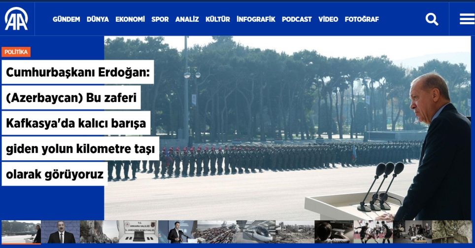 Xəbərlərdə Türkiyə və Azərbaycan liderlərinin Cənubi Qafqazda dayanıqlı sülh və sabitliyin təmin olunması, Bakı və Ankaranın sıx həmrəyliyi, eləcə də regional əməkdaşlığın inkişafı ilə bağlı bəyanatlarından sitatlar gətirilib. Prezident İlham Əliyevin Vətən müharibəsi zamanı Türkiyə Prezidenti Rəcəb Tayyib Ərdoğanın “Azərbaycan tək deyil, Türkiyə Azərbaycanın yanındadır!” bəyanatının çox ciddi mesaj olması və “Azərbaycan xalqı bu qardaş dəstəyini heç vaxt unutmayacaq” ifadəsi, eləcə də Türkiyə Prezidenti Rəcəb Tayyib Ərdoğanın “Bu Zəfər Qafqazda davamlı sülhə gedən yolun məhək daşıdır” sözləri Anadolu agentliyinin “Baş xəbər” rubrikasında oxucuların diqqətinə çatdırılıb.