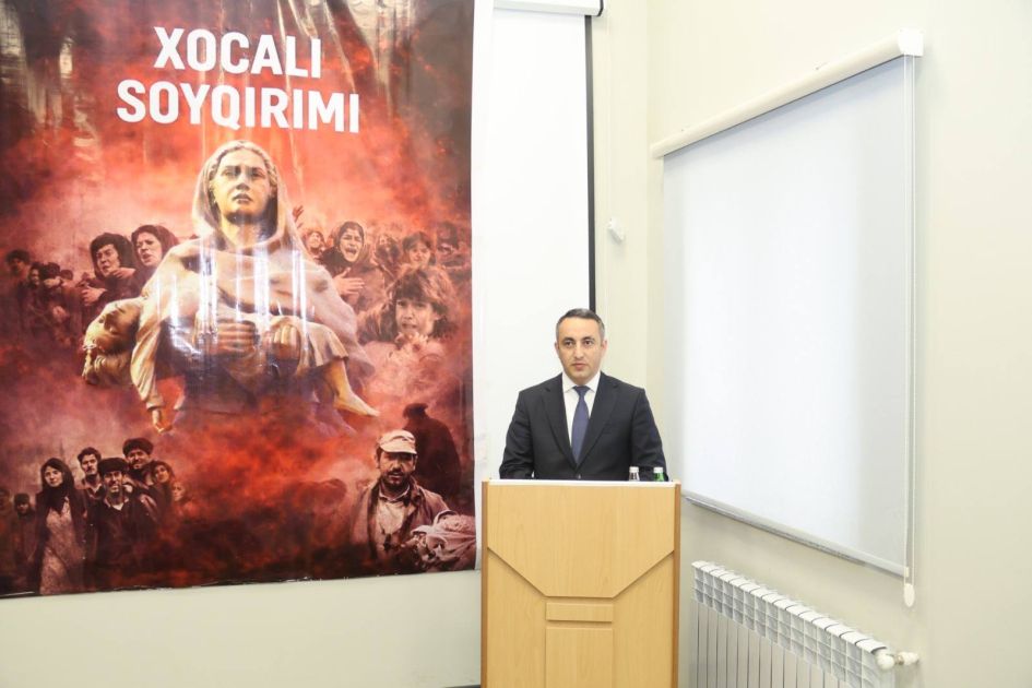 Qarabağ Regional Təhsil İdarəsinin müdiri Sənan Mənsimli çıxış edərək bildirib ki, 1992-ci il fevralın 25-dən 26-na keçən gecə Xocalıda dinc əhaliyə qarşı misli görünməmiş vəhşilik törədilib, bu faciə təkcə Azərbaycan xalqına deyil, bütün bəşəriyyətə qarşı yönəlmiş ağır cinayətdir.