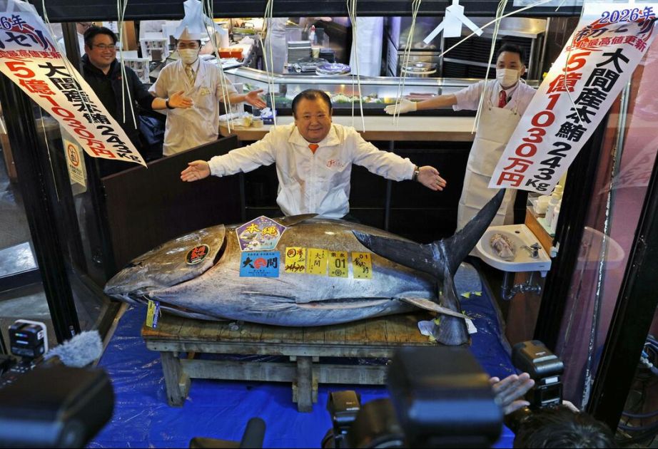 Tokionun “Toyoşu” balıq bazarında ilin ilk hərracında 243 kiloqramlıq mavi tuna balığı 510 milyon yenə ( təxminən 3,2 milyon dollar) satılıb.