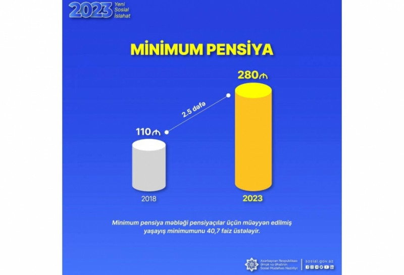 Bu ilin əvvəlindən reallaşdırılan yeni sosial islahat paketinin tərkib hissəsi kimi, Prezident İlham Əliyevin təsdiq etdiyi yeni Qanunla minimum aylıq əmək pensiyasının məbləği 2023-cü il fevralın 1-dən 280 manata çatdırılıb.