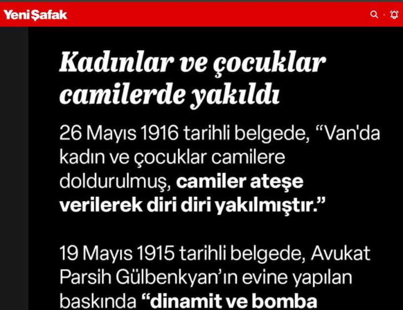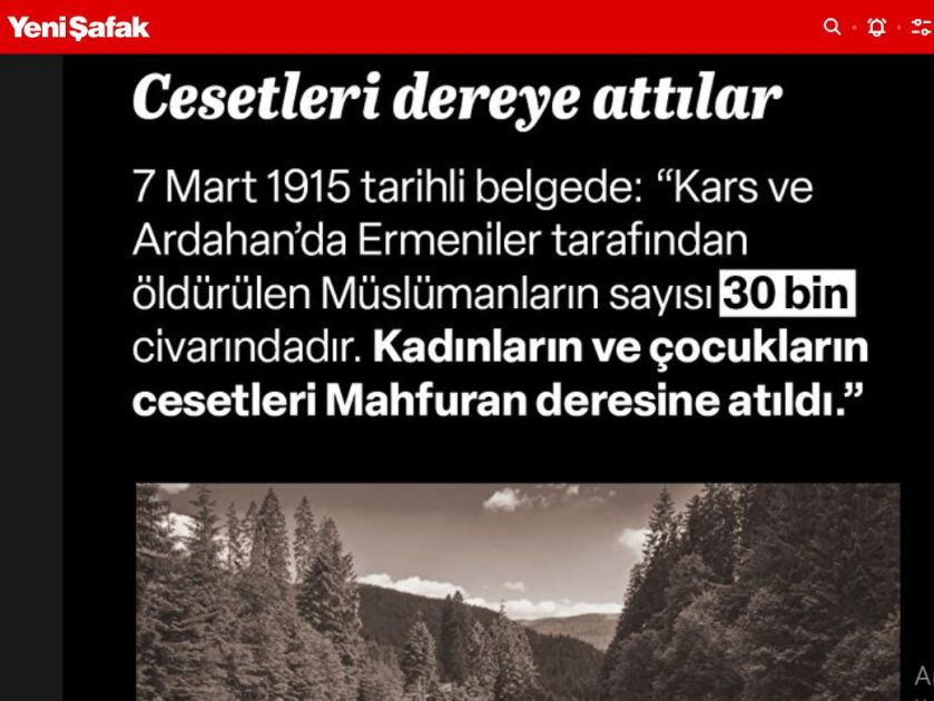 “Yeni Şafak” qəzeti Türkiyə Böyük Millət Məclisinin (TBMM) 1915-ci ildə və ondan sonrakı illərdə Anadoluda erməni vəhşiliklərini əks etdirən fotoşəkillərin yer aldığı arxiv sənədlərini dərc edib.