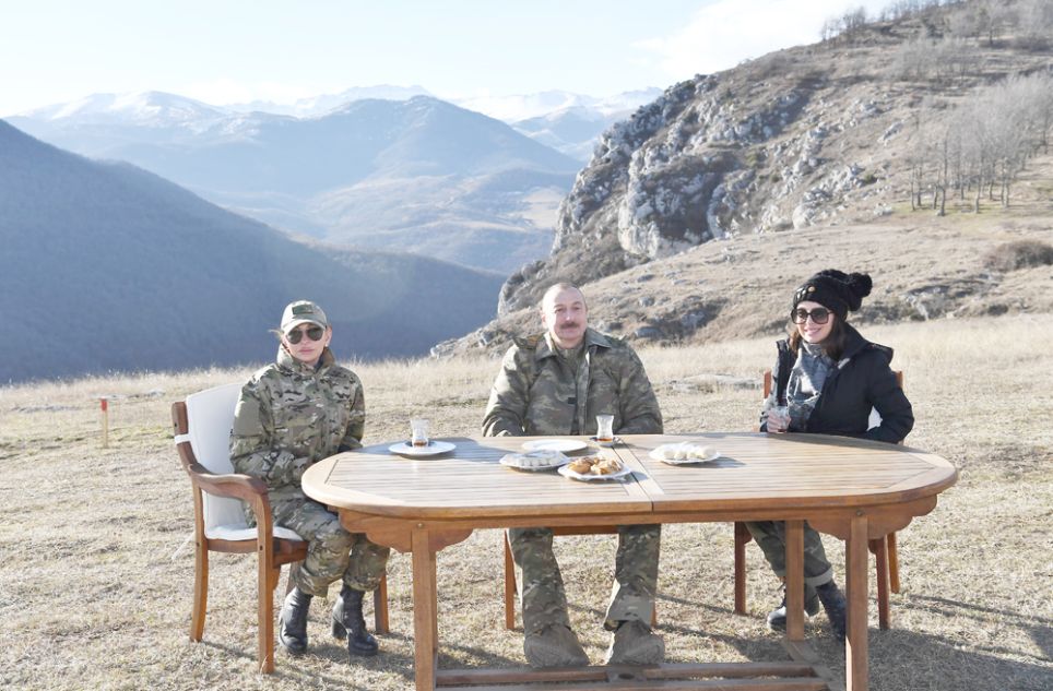 Müzəffər Ali Baş Komandan İlham Əliyev tonqalın yanında oturaraq armudu stəkanda pürrəngi çay içib Novruzun rəmzlərindən sayılan şəkərbura, paxlava yedi!