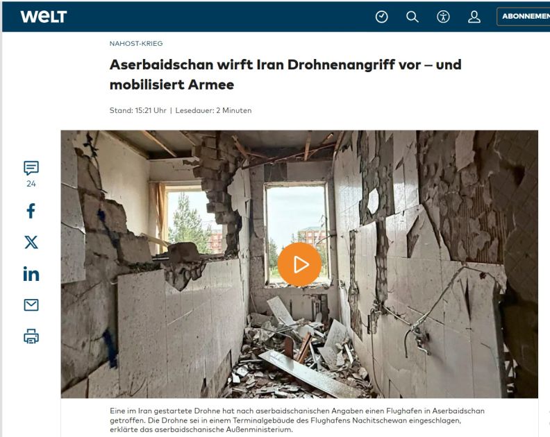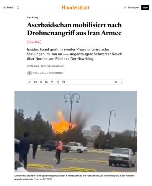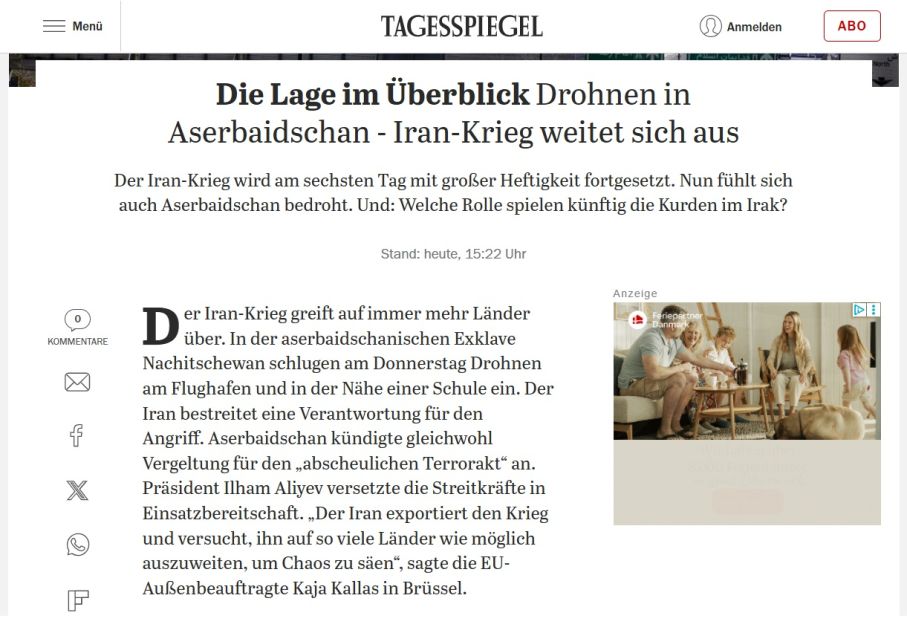 “Tagesspiegel” qəzeti İran müharibəsinin getdikcə daha çox ölkəyə yayıldığını qeyd edərək, PUA-ların Azərbaycanın Naxçıvan Muxtar Respublikasının ərazisində hava limanı yaxınlığında və bir məktəbin yaxınlığında düşdüyünü yazıb. Azərbaycanın bu iyrənc terror aktına görə cavab tədbirləri görəcəyini açıqladığı, Prezident İlham Əliyevin göstərişi ilə Silahlı Qüvvələrin döyüş hazırlığı vəziyyətinə gətirildiyi qeyd olunub.
