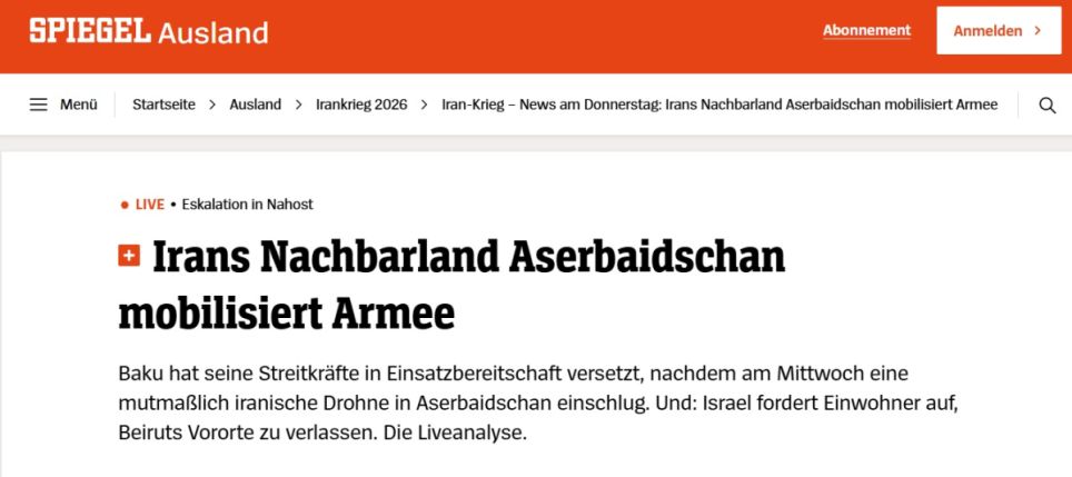 “Spiegel” jurnalının Yaxın Şərqdəki vəziyyətlə bağlı daim yenilənən xəbər bloqunda yer alan məlumatda hücumdan sonra Azərbaycan Silahlı Qüvvələrinin yüksək döyüş hazırlığı vəziyyətinə gətirildiyi qeyd olunub.
