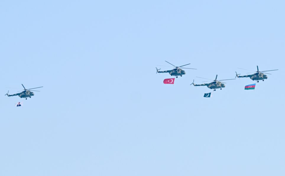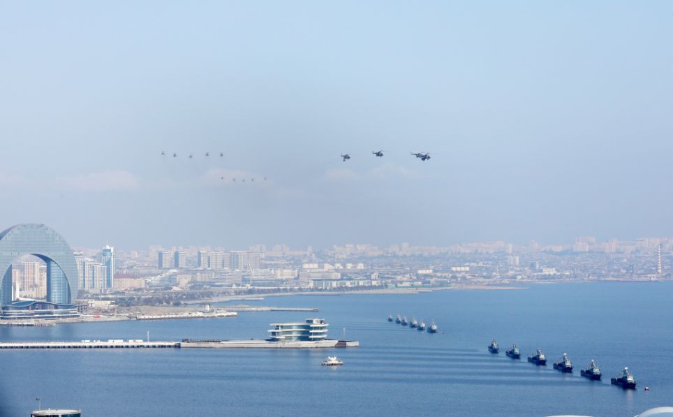 Azərbaycan və Türkiyə pilotlarının iştirakı ilə aviasiya nümayiş uçuşları isə izləyicilər üçün unudulmaz olub. Parad çərçivəsində uçan Mİ-17 döyüş-nəqliyyat helikopterləri Azərbaycan, Türkiyə və Pakistan respublikalarının Dövlət bayraqlarını daşıyıb, Mİ-17 helikopteri Ümummilli Lider Heydər Əliyevin portretini nümayiş etdirib. Həmçinin uzaqmənzilli hava-yer tipli raketlərlə təchiz olunmuş Mİ-17 döyüş-nəqliyyat helikopterləri, MFİ-17 təlim təyyarələri, L-39 təlim təyyarələri, İL-76 hərbi-nəqliyyat və silahlanmaya yeni qəbul edilmiş C-27J yük təyyarələri, silahlanmaya yeni qəbul edilmiş JF-17 (Cİ EF) çoxməqsədli qırıcı təyyarələr, Türkiyə Hərbi Hava Qüvvələrini təmsil edən F-16 çoxməqsədli qırıcı təyyarələr, modernizasiya olunmuş SU-25-Laçın hücum təyyarələri iftixar dolu hisslər yaşadıb. SU-25 hücum təyyarələri isə Azərbaycan Bayrağının rənglərini paytaxt səmasında canlandırıb.