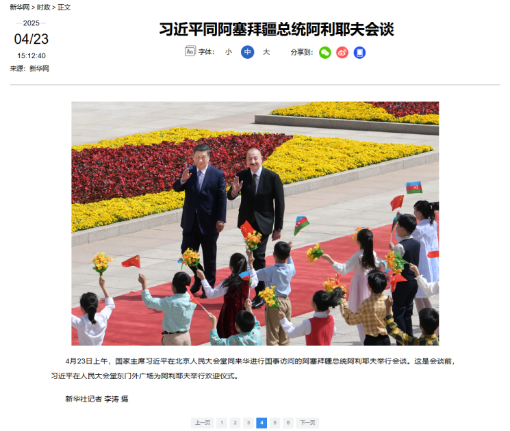 Çinin milli xəbər agentliyi olan Sinxuanın “Si Cinpin Azərbaycan Prezidenti İlham Əliyevlə danışıqlar aparıb” başlıqlı məqaləsində deyilir ki, beynəlxalq vəziyyətin dəyişməsindən asılı olmayaraq Azərbaycan-Çin münasibətləri öz inkişaf dinamikasını qoruyub saxlayıb, iki ölkə qarşılıqlı hörmət, bərabərlik və qarşılıqlı faydalı əməkdaşlıq prinsipləri əsasında inkişaf edərək, strateji tərəfdaşlıq səviyyəsinə yüksəlib.