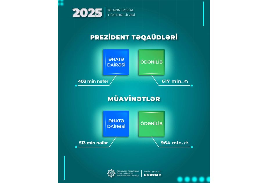 Bu ilin on ayında müavinətlər üzrə 964, Prezident təqaüdləri üzrə 617 milyon manat ödənilib