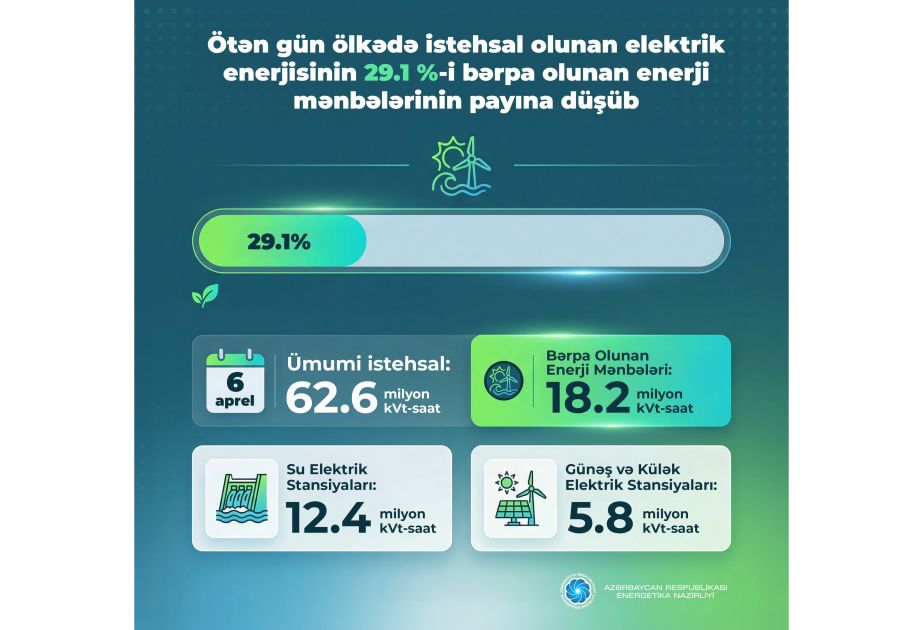 Ötən gün ölkədə elektrik enerjisinin 29 faizdən çoxu bərpaolunan mənbələrdən əldə olunub
