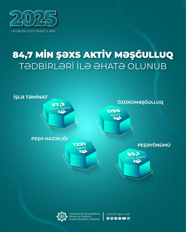 Məşğulluq sahəsində də işlər uğurla davam edir. Rəsmi statistikaya görə, cari ilin yanvar-mart aylarında Əmək və Əhalinin Sosial Müdafiəsi Nazirliyinin (ƏƏSMN) tabeliyindəki Dövlət Məşğulluq Agentliyinə (DMA) 84,7 min şəxs aktiv məşğulluq tədbirlərinə cəlb olunub. Onlardan 27,2 min şəxsin münasib işlərlə təmin edilməsi, 1200-dək şəxsin kiçik ailə təsərrüfatlarını yaratmaq üçün özünüməşğulluq proqramına cəlb olunması məşğulluğun genişləndirilməsi üçün atılan addımların göstəricisidir. Ümumiyyətlə, DMA bu ilin sonunadək 420 mindən çox şəxsi aktiv məşğulluq proqramlarına cəlb etməyi hədəfləyib. Bu proqram çərçivəsində Qarabağ və Şərqi Zəngəzurda artıq 266 şəxsin öz doğma torpaqlarında kiçik təsərrüfatlarını qurmasına dəstək verilib.