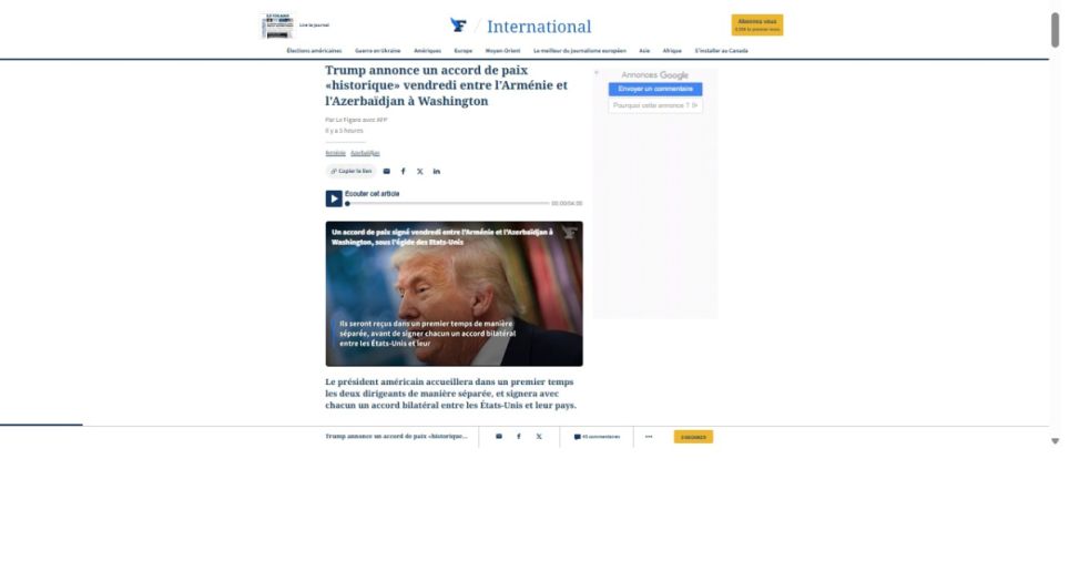 AZƏRTAC xəbər verir ki, fransız mətbuatı bu görüşün məqsədinin Azərbaycan və Ermənistan arasında onilliklərdir davam edən münaqişəyə son qoymaq və sülh sazişinə dair yekun razılaşmanı əldə etmək olduğunu yazır. Qeyd edilir ki, ABŞ Prezidenti Donald Tramp avqustun 8-də Vaşinqtonda Prezident İlham Əliyev və Baş nazir Nikol Paşinyanla birlikdə Ağ evdə sülhə dair sənədin imzalanma mərasimi olacağını vurğulayıb. Bu sənəd onilliklərdir davam edən Qarabağ münaqişəsinə son qoymağı hədəfləyir. “Bir çox lider müharibəyə son qoymağa çalışdı, ancaq bunu yalnız TRUMP bacardı”, - deyə D.Trampın sosial şəbəkələrdəki sözlərindən sitat gətirilib.